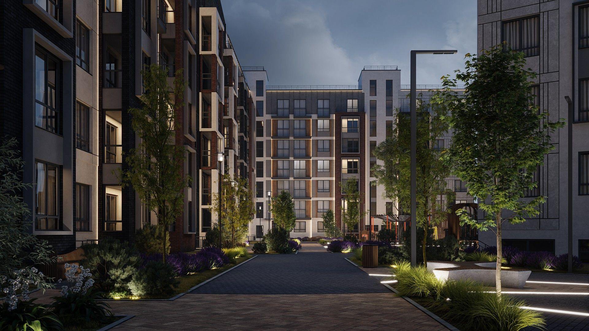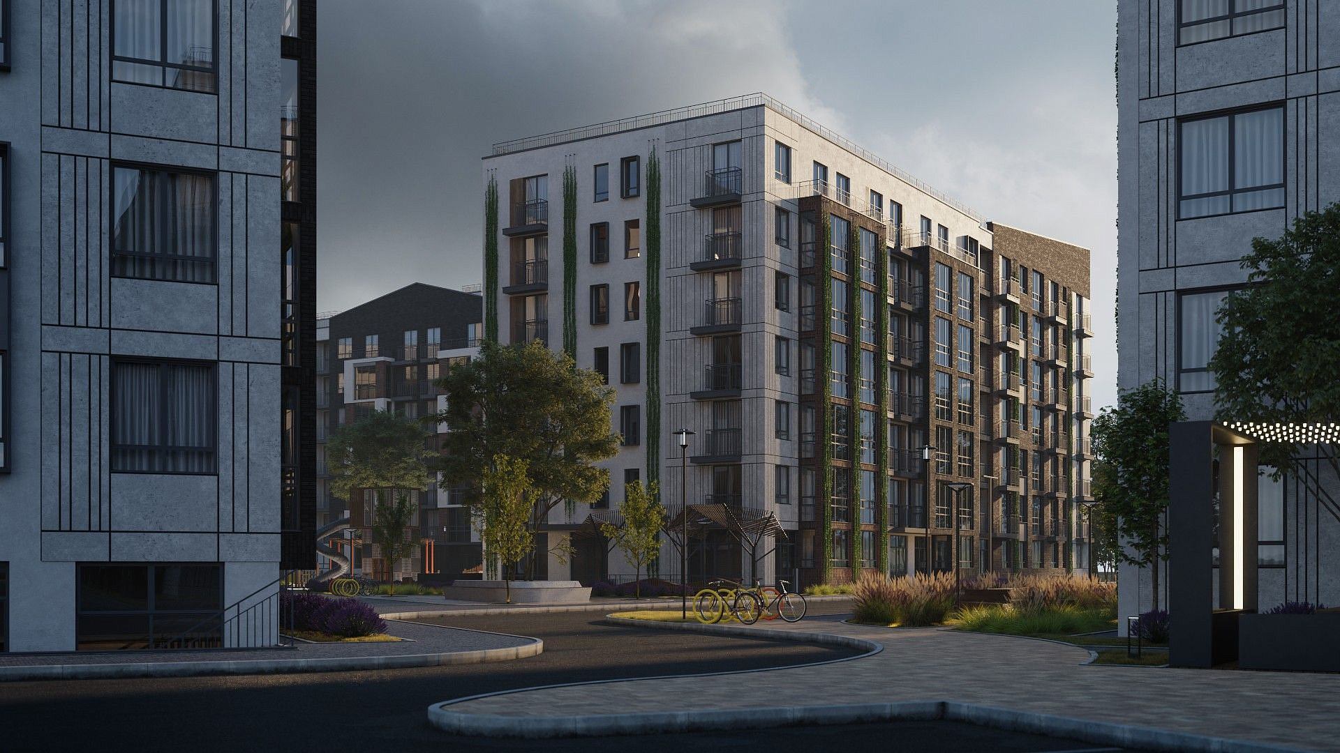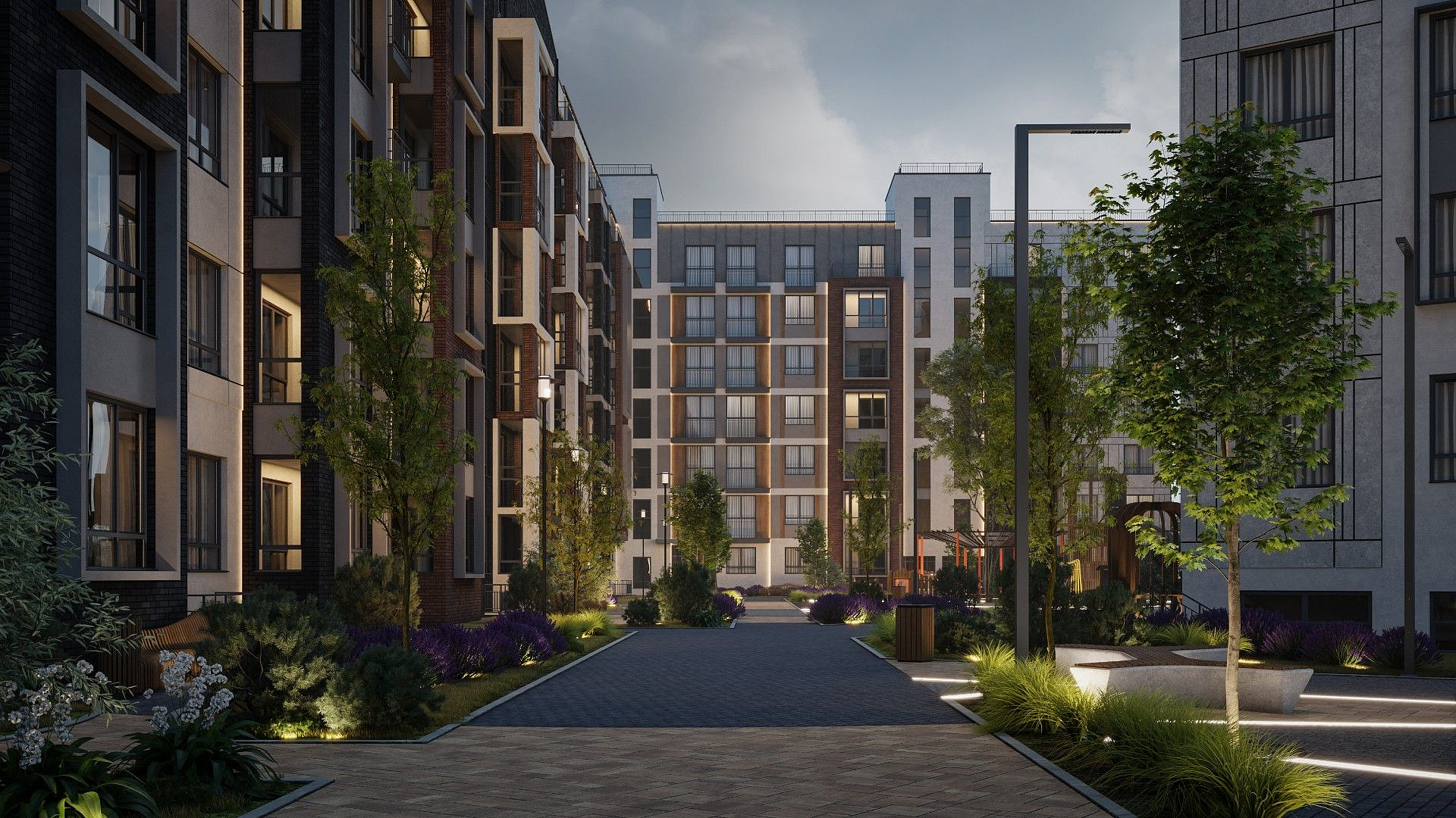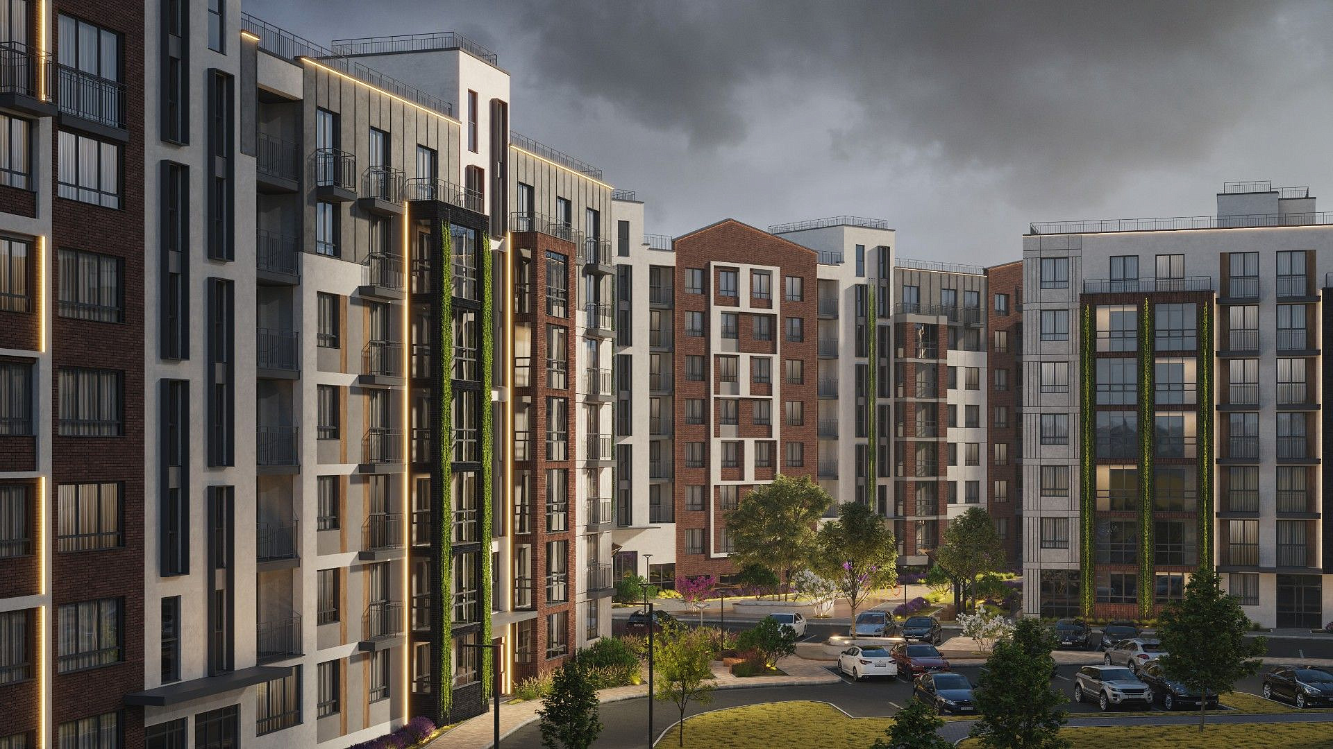 Экологичные материалы, вертикальное озеленение и мягкая подсветка гармонируют с окружающей средой и органично вписываются в природный ландшафт вокруг жилого комплекса.