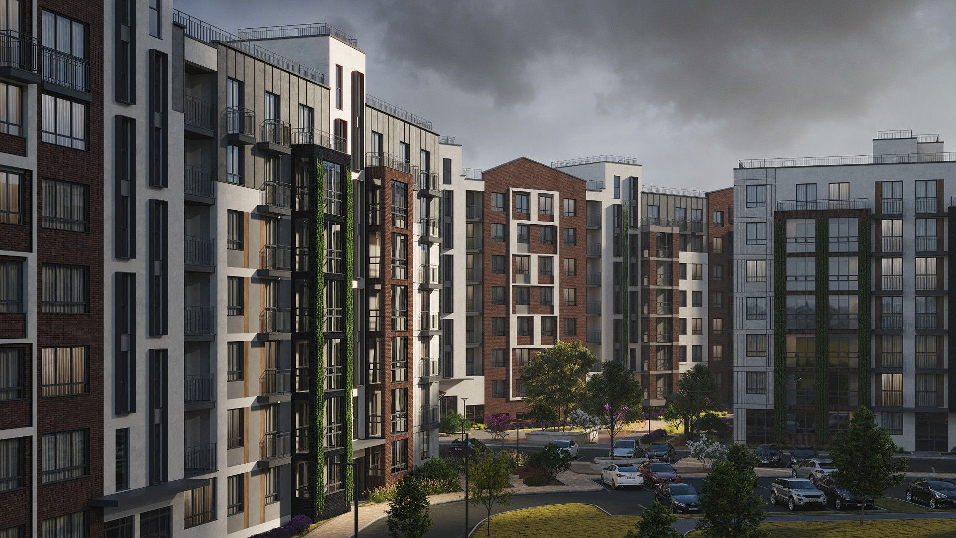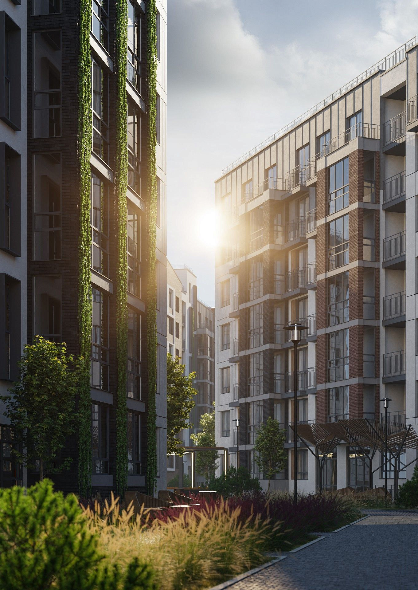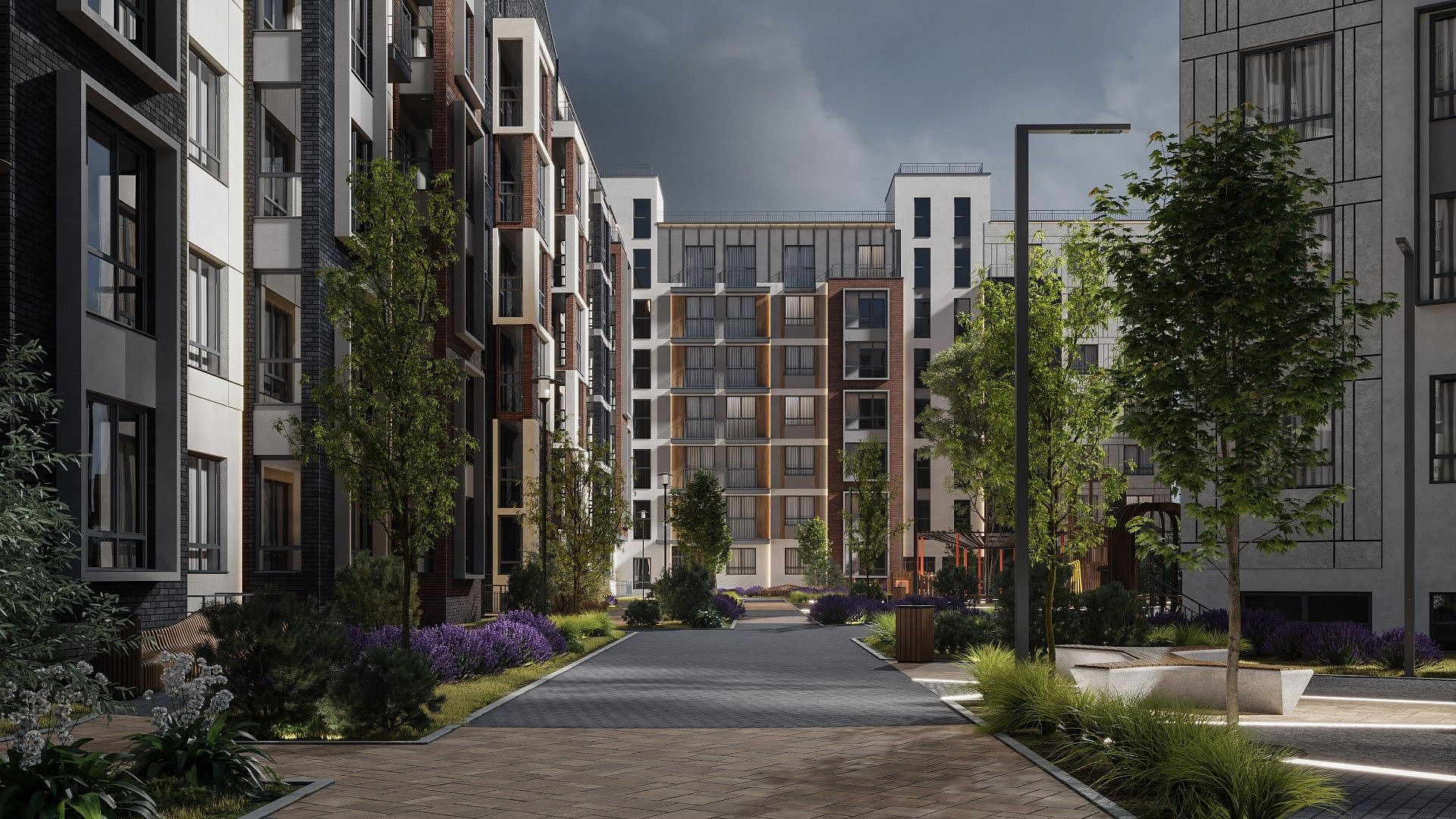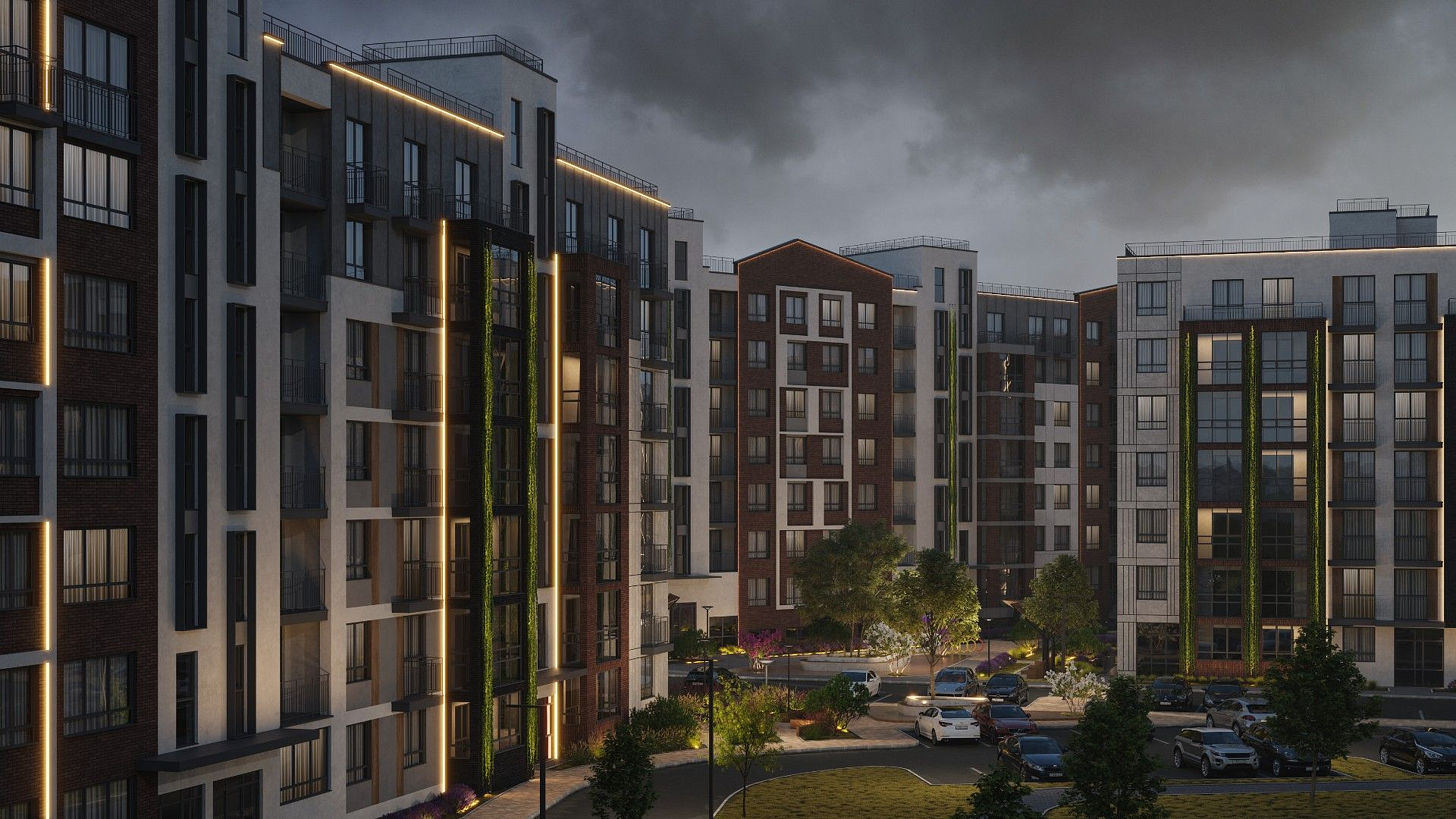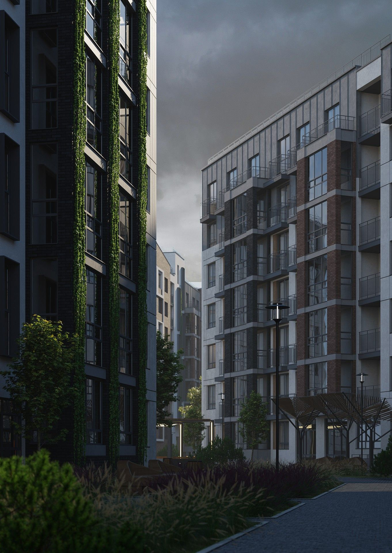 Экологичные материалы, вертикальное озеленение и мягкая подсветка гармонируют с окружающей средой и органично вписываются в природный ландшафт вокруг жилого комплекса.