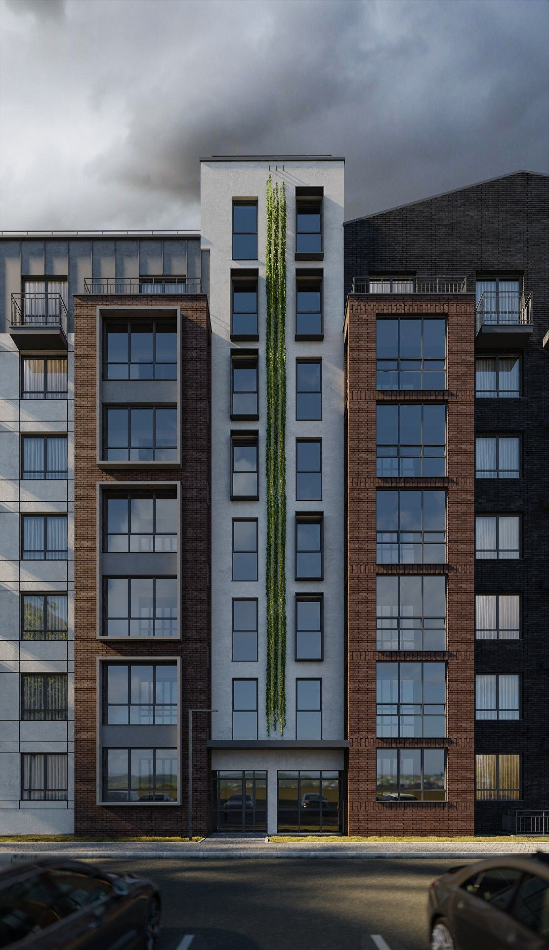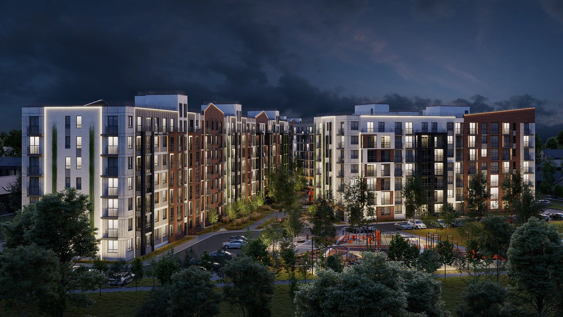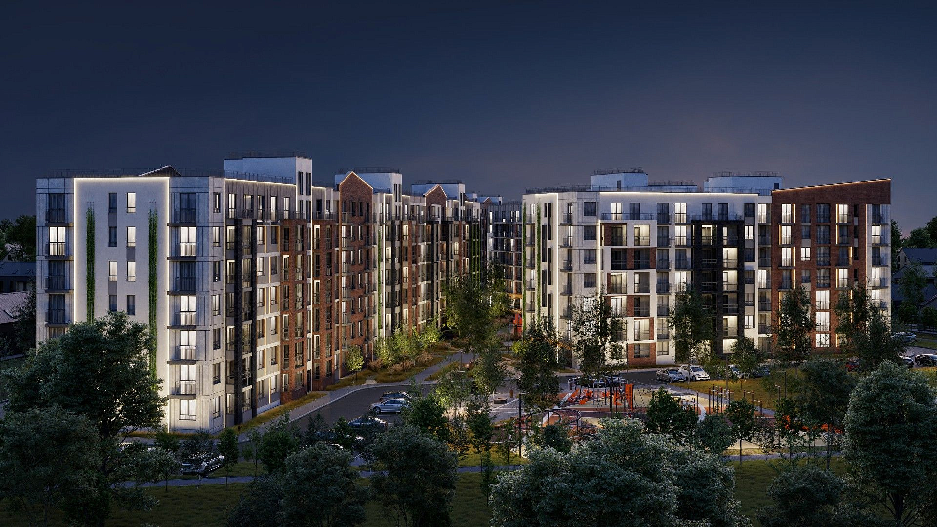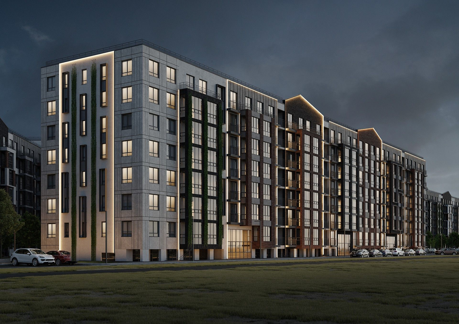 Экологичные материалы, вертикальное озеленение и мягкая подсветка гармонируют с окружающей средой и органично вписываются в природный ландшафт вокруг жилого комплекса.