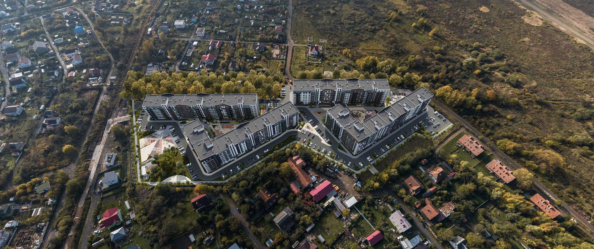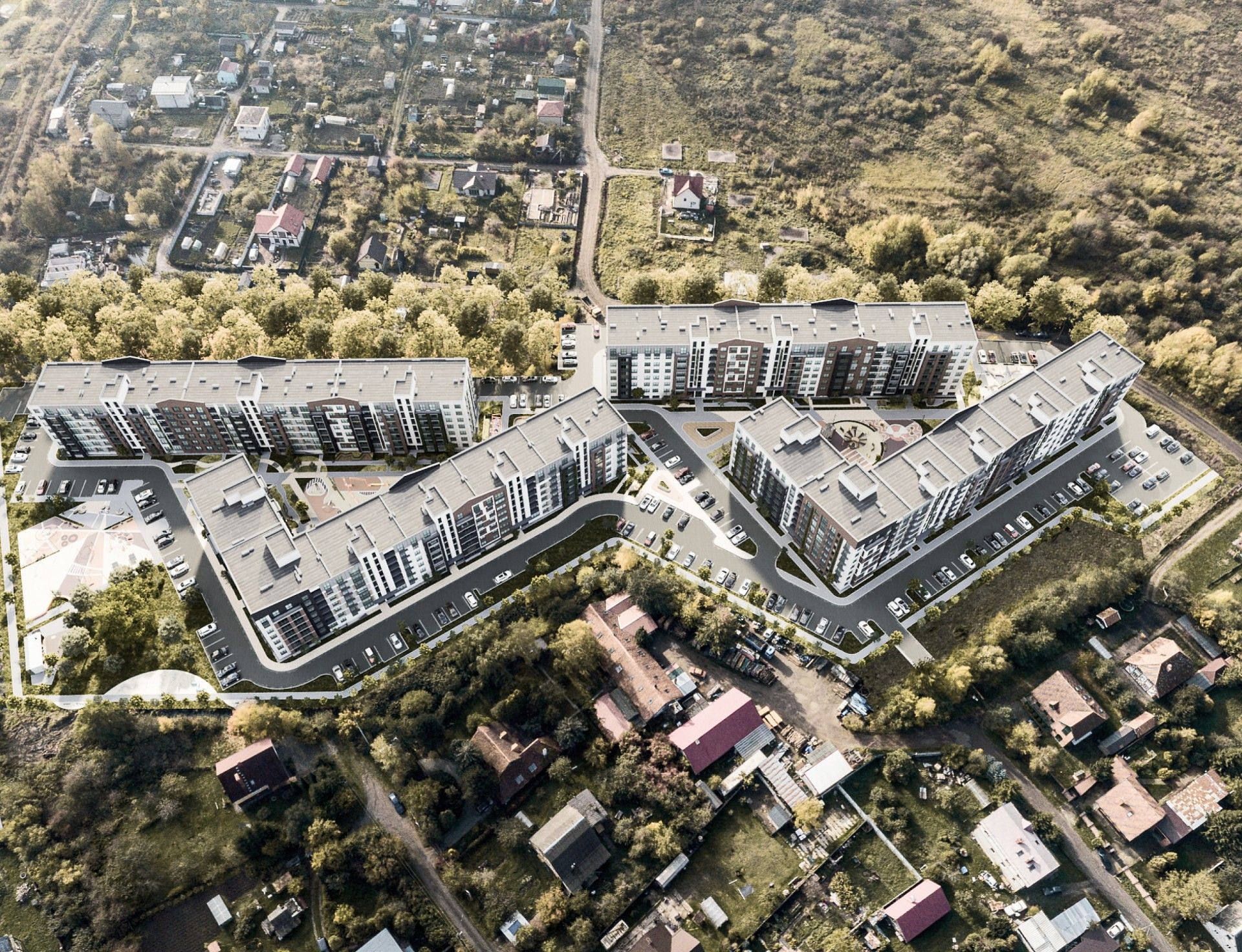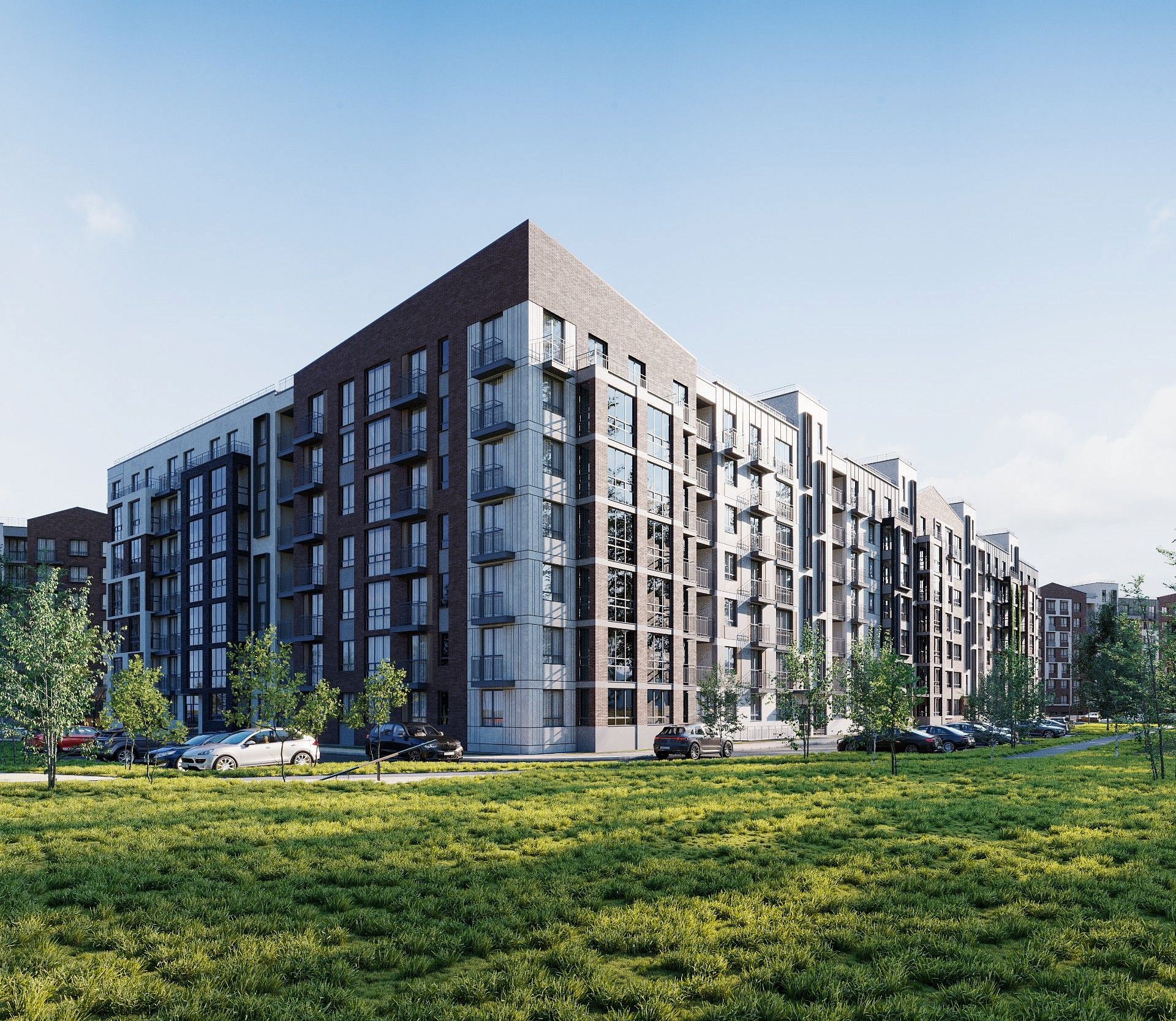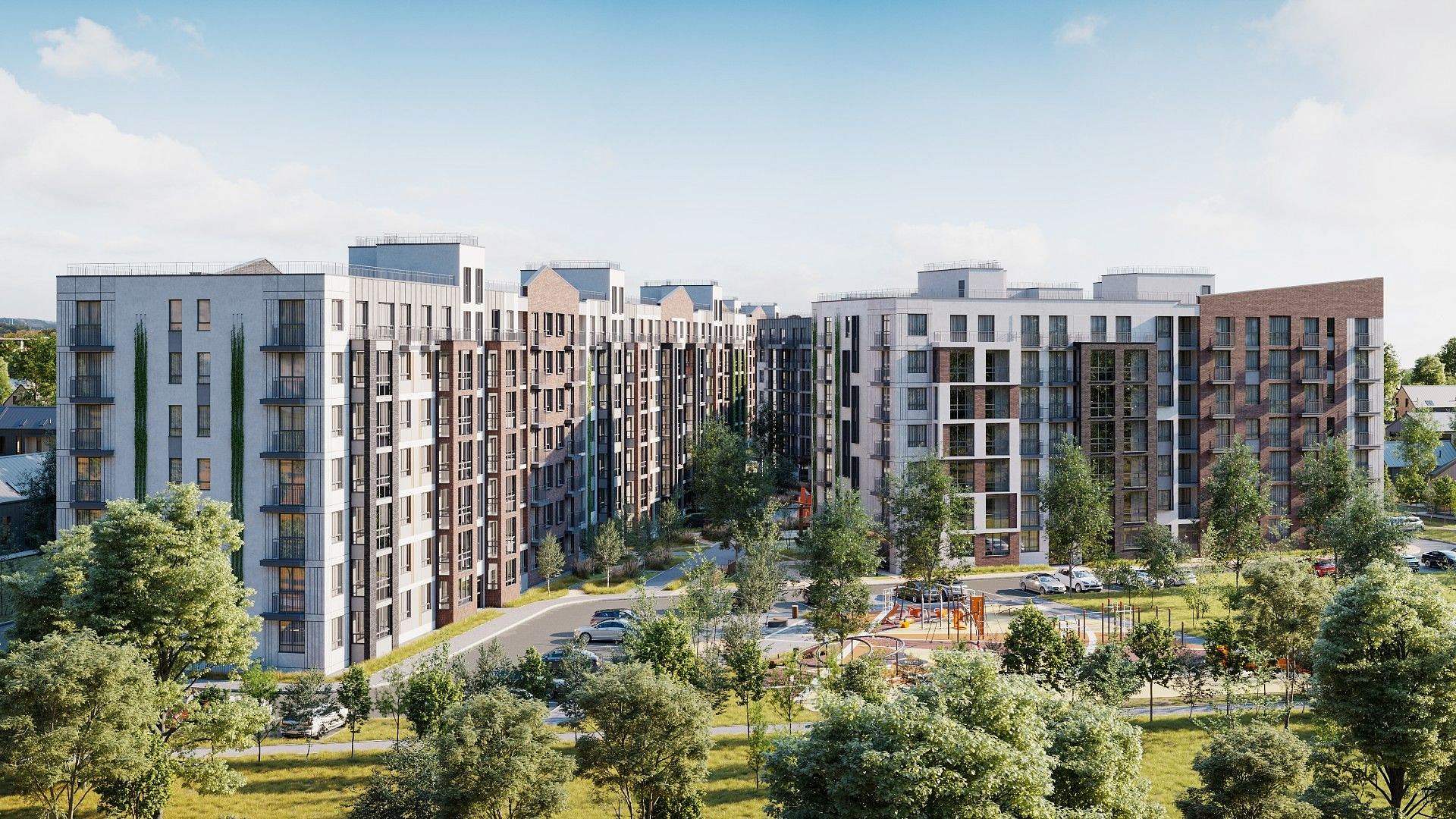 Для отделки фасадов выбраны современные и экологичные материалы, которые аккуратно подчеркивают формы и выгодно выделяют комплекс в окружающем пространстве, не нарушая при этом общей гармонии.