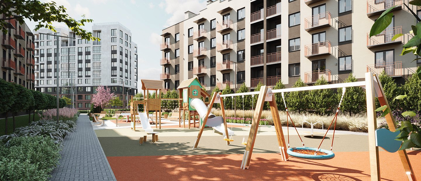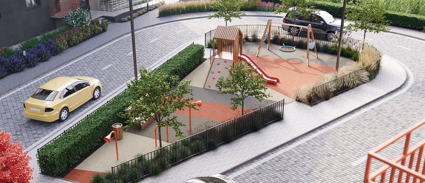 Каждая детская площадка - уникальный мир игр с безопасным резиновым покрытием, что позволяет детям быть свободными в движении, а родителям сохранять спокойствие. Все территория продумана и реализована как развивающая среда, с обилием горок, качелей и игровых домиков. Жители смогут проводить много времени на свежем воздухе, ведь во дворах есть специально оборудованные лаундж зоны для отдыха (скамейки) в окружении зеленых насаждений и благоустроенных дорожек.